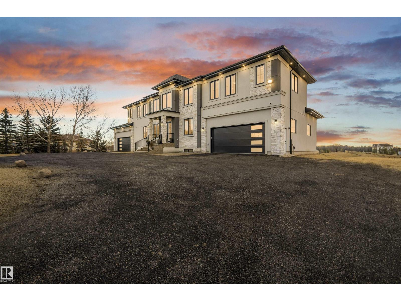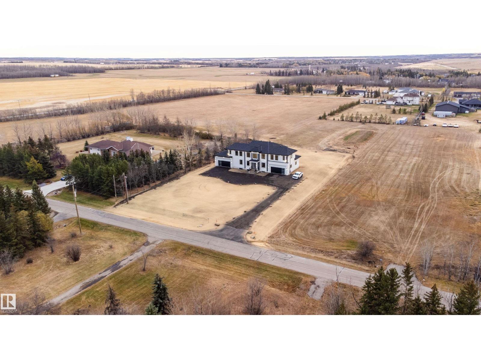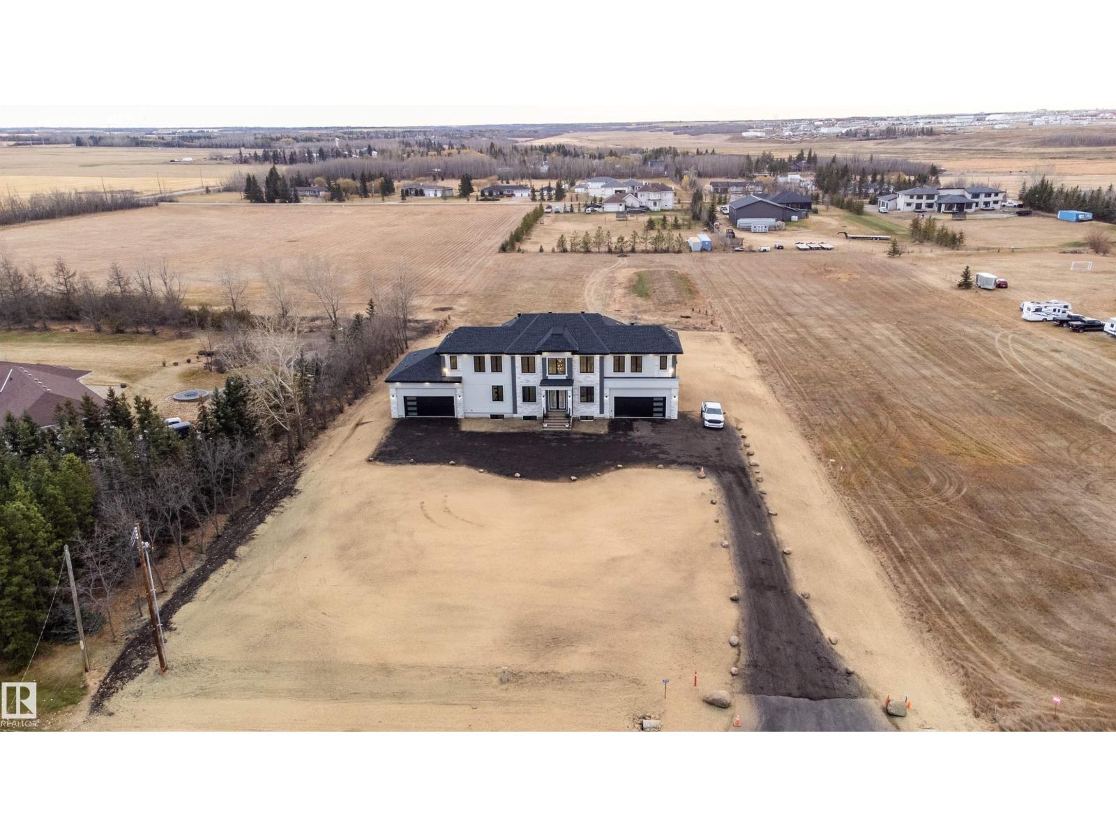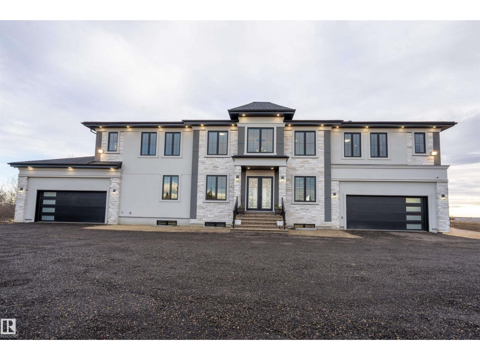Welcome to this stunning custom estate in Beau Vista North, mins from Edmonton & Beaumont! The main foyer greets you with designer tile, warm light, and space to welcome guests. This luxury home features HYDRONIC heating in both GARAGES, Heated flr with CERAMIC TILES on main & basement, 8 beds, 5.5 baths, over 6340 sq. ft. of living space, & finished basement with 2 beds, full bath, rec room, a separate entry, kitchen/laundry rough-ins—perfect for guests. Main flr boasts grand kitchen, spice kitchen, great room, laundry, den/bdrm, & bdrm w/full bath. Upstairs: 4 big bdrms incl lavish primary, 3 baths, laundry, fam rm. Home has curved stairs, 8' doors, LED lights, speakers, security, 400 amp service for future shop/storage, 6-car garage. Designed for style, function & countryside living mins from city! 2.50 Acres land with nearly 50% recently landscaped with 500 cu yd of top soil & hydroseeding. ideal for big families or those craving luxury paired with country charm. Don’t miss this rare opportunity! (id:62055)